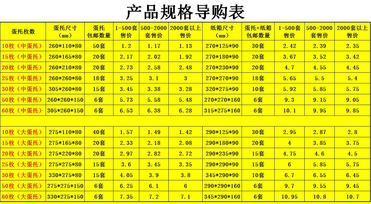 珍珠棉蛋托可以生产加工成什么类型的呢?要满足鸡蛋的长途运输,对珍珠棉蛋托的生产要求也是挺高的。下面一组数据是我厂为各养鸡、养鸭厂制定的大小尺寸。